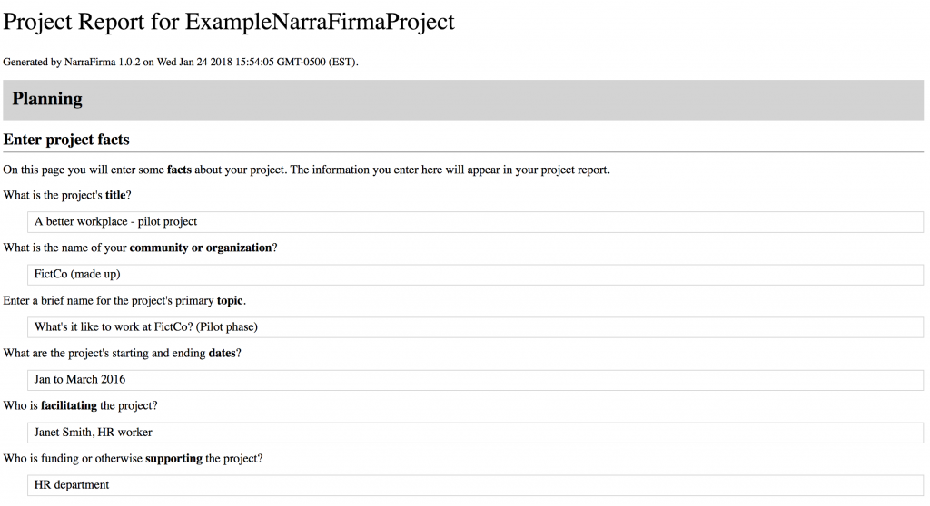 Second, in the application, you can print an HTML project report that summarizes everything you typed into NarraFirma (for use in other software).