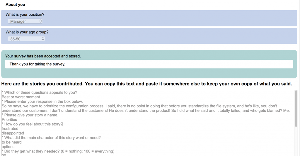 First, in the survey, participants can see and copy a summary of their submitted stories (and you can control whether people see this or not).