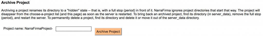 C2. Project archiving. In the node.js version of NarraFirma, you can now archive a project. This actually just renames the project folder with a dot in front of it, which causes NarraFirma to ignore it, and you could have done that by hand before; but it’s easier now.
