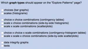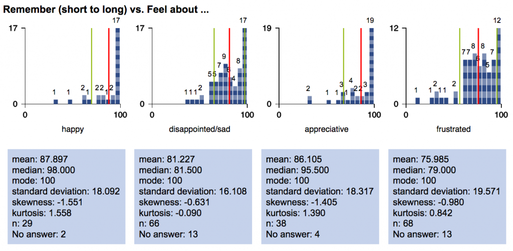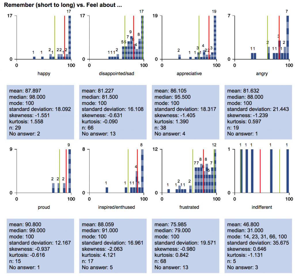 A9. Choice x choice x scale graphs. This new graph type was suggested by a NarraFirma user, and I have to say I was amazed to realize that I had never even thought of building such a graph before. I’m calling it a “contingency-histogram table,” and it looks like this.