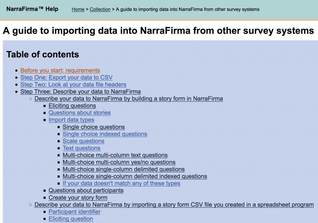 B4. Pre-import data check. You can now run a verbose pre-import check of your CSV file that will tell you exactly what NarraFirma read correctly and incorrectly, before you import any stories. This will be a boon to people who have been importing stories over and over to get their import formats and settings right. The log appears in your browser console, and it tells you in which row and column errors are detected, so you can fix import problems more easily.