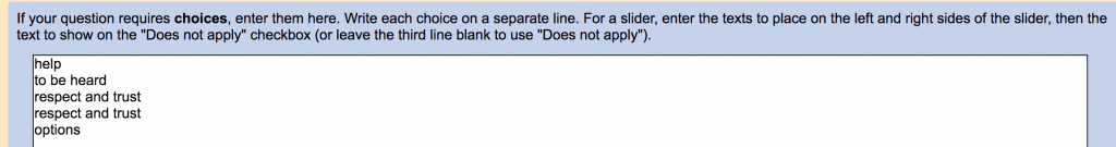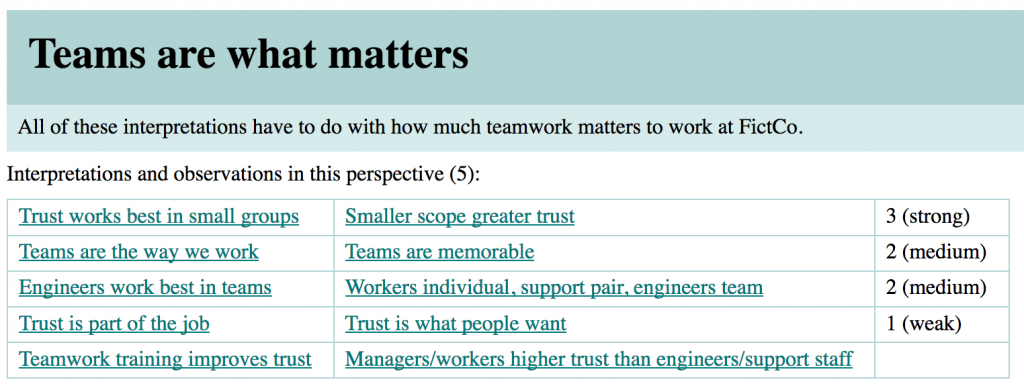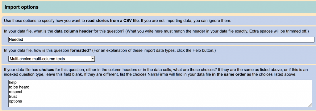 In this example, putting “respect and trust” in the list twice, once for “respect” and once for “trust,” will combine the answers into one larger category. Note that this does change your data during import, and you can’t take such consolidated answers apart again. But in many cases this option will help you convert weak patterns into stronger ones. (If you entered your data in NarraFirma, you can export it and import it again to consolidate it.)