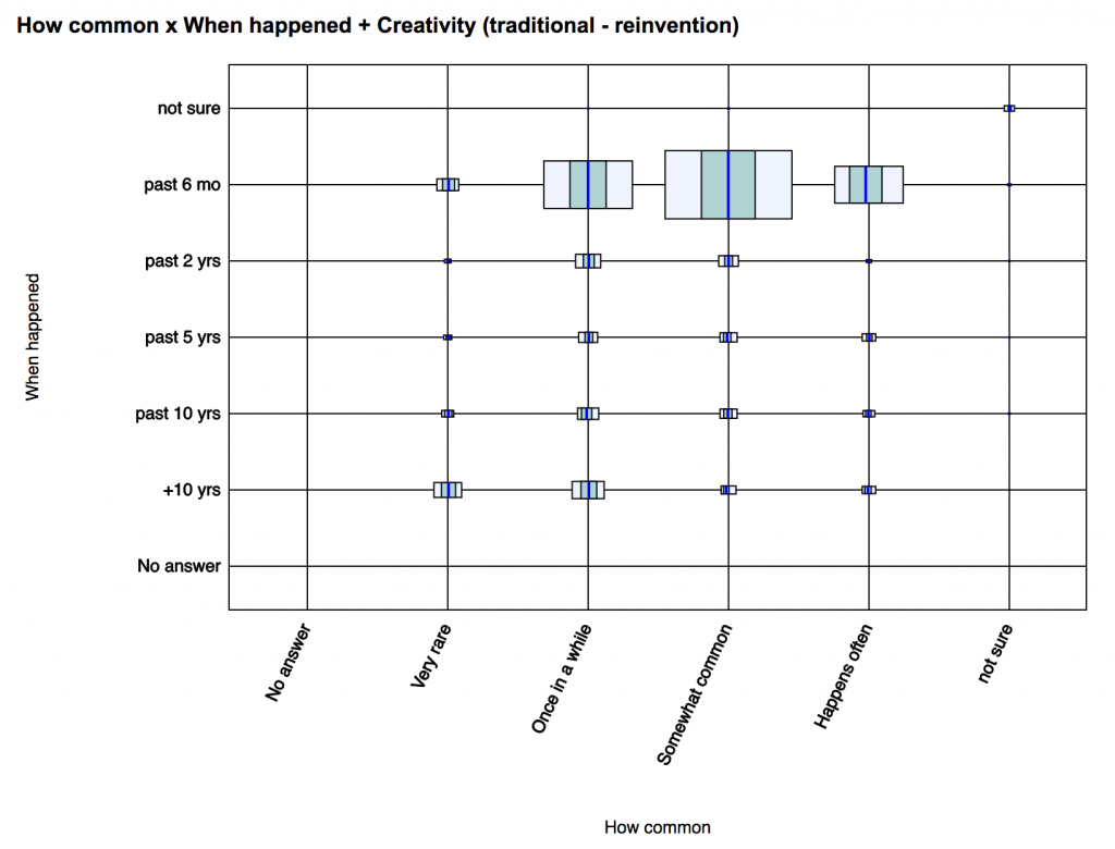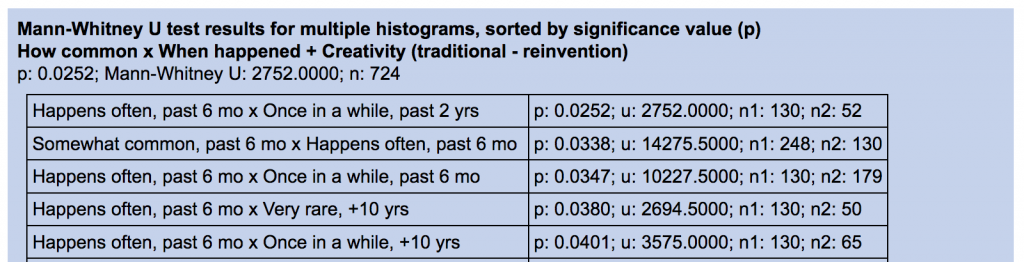 In this example, when somebody said a story was both common and recent, they were more likely to say the story showed “traditional” thinking than when they said the story was rarer and further in the past. This may or may not mean anything, of course – beware of equating statistical significance with actual importance! – but it could be a pattern that worth exploring (by comparing subsets of stories).