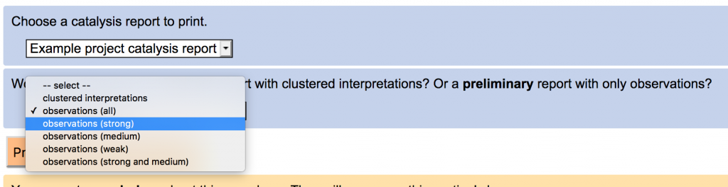 A2. Observations-only catalysis report. You can now save an catalysis report with only observations in it, for use in a catalysis session (where a group of people write and cluster interpretations). You can select all of the observations or just a subset based on strength.