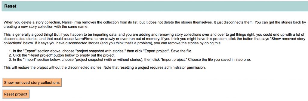 C1. Project reset. You can now empty out a project completely. Why would you want to do this? Because now, when you export a project to a JSON backup file, NarraFirma strips out any stories that were left disconnected (but not deleted) when their story collection was deleted. So if you have been importing the same CSV data file over and over (which you should no longer have to do, but still), you can export the project, reset it, and re-import it, and that will clear out any intermediate stories that didn’t load perfectly.
