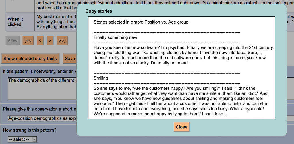 A5. Copy selected story texts. There is a new button on the Explore patterns page. It opens a window with just the texts of the selected stories in a graph, so you can copy and paste them elsewhere.