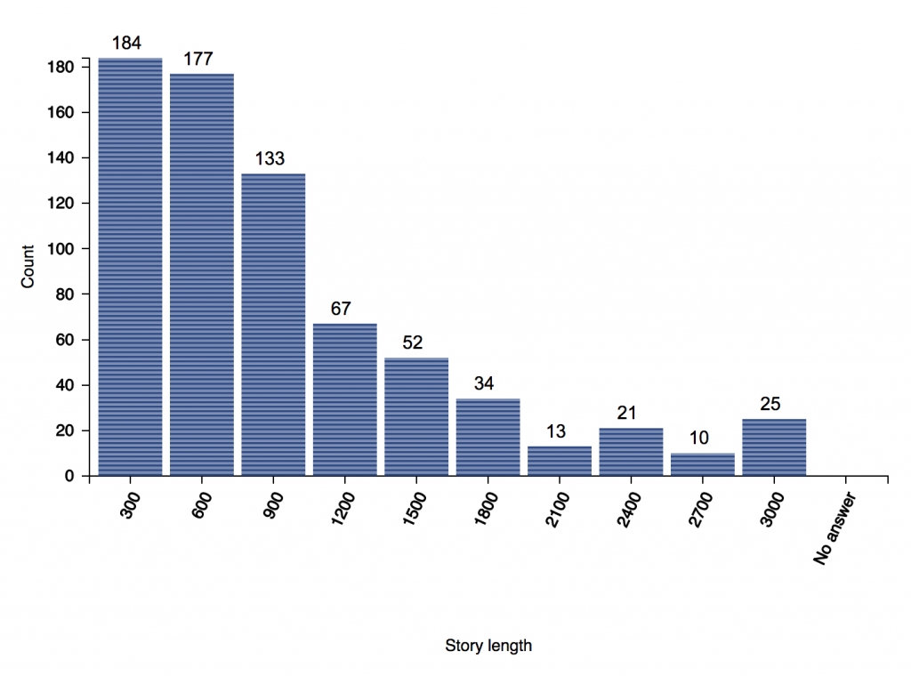 On the “Spot-check graphs” page, there is a hard-coded maximum of 5000 characters counted (before the rest pile up in the last bin). In the catalysis report, you can choose your own maximum based on the story lengths you have. In this example, the last bin (2700 to 3000 characters) also includes stories with more than 3000 characters.
