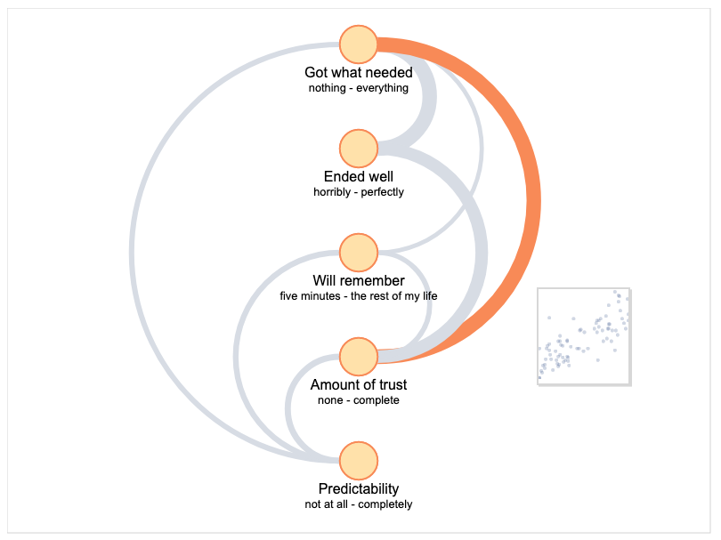 The new “correlation map” diagram shows relationships among all scale questions in a project, overall or in subsets of stories with particular answers to a choice question. You can hover over nodes to see histogram popups and over links to see scatterplots.