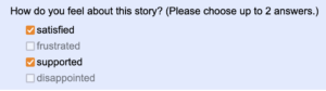 To avoid people becoming confused when checkboxes gray out, there is a new story-form field where you can specify what the survey should say on a question with a max-answers limit. By default (if you specify nothing), the story form will say “(Please choose up to # answers.)” after the question text.