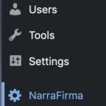 After you have installed the NarraFirma plugin, you should see a new NarraFirma menu item in the Dashboard menu. It should look like this: