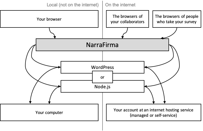 - If you install your NarraFirma server on an internet-connected computer (usually on a hosted service), other people will be able to interact with NarraFirma using their own browsers. You will create accounts for each of your collaborators, and they will enter their user ids and passwords to connect to the server. Anonymous visitors who take your web-based surveys will also connect to your NarraFirma server (the survey part only) using their browsers.